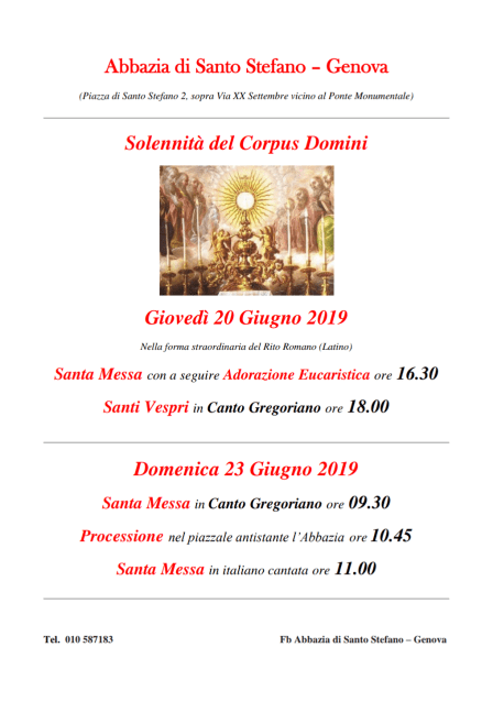 - Corpus Domini a Genova all’Abbazia di S. Stefano giovedì 20 e domenica 23 giugno