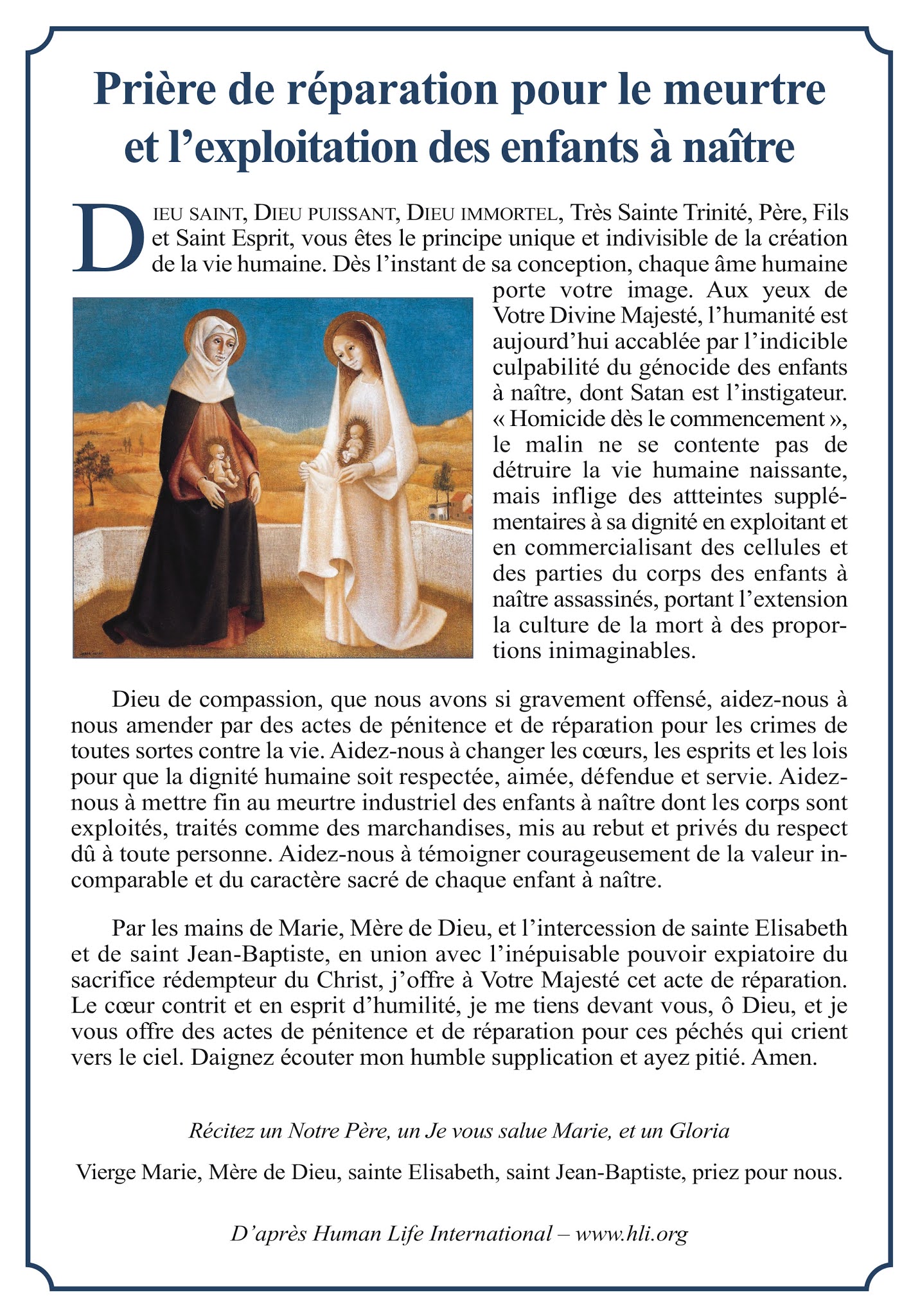 | 31 mai : Prière de réparation pour l’avortement et l’exploitation des enfants à naître Posted: 31 May 2021 04:34 AM PDT L’organisation pro-vie catholique Human Life International (HLI) appelle en ce 31 mai, fête de la Visitation dans le nouveau calendrier (et celle de Marie, Reine, dans le calendrier traditionnel) à participer à une Journée internationale de prière de réparation pour le meurtre et l’exploitation des enfants à naître par l’avortement et l’utilisation de leur corps pour diverses industries, en particulier l’industrie pharmaceutique.Cette initiative se rapporte à l’utilisation de lignées cellulaires obtenues à la suite de prélèvements sur des fœtus avortés pour la réalisation de la plupart des vaccins anti-COVID (et la totalité de ceux distribués en France), mais pas seulement : de nombreux vaccins, médicaments, et même l’industrie alimentaire font appel à ces lignées, que ce soit pour les essais préalables, la production ou les tests de contrôle de qualité. Voici la présentation de l’initiative par HLI : L’avortement a ouvert la porte au développement d’une industrie macabre : le commerce de parties du corps de fœtus pour la recherche médicale. Il nous faut faire connaître, dénoncer et mettre fin à ce mal. La vie humaine est sacrée, elle n’est pas une marchandise manufacturée. La seule force humaine ne pourra pas chasser les ténèbres de cette industrie répugnante. Nous devons nous mettre à genoux et prier. C’est pourquoi Human Life International inaugure une Journée de prière de réparation pour le meurtre et l’exploitation des enfants à naître. En ce jour de visite, le lundi 31 mai, nous vous invitons à vous joindre à nous pour réciter la Prière de réparation pour le meurtre et l’exploitation des enfants à naître. Soyons unis par cet acte de prière et de réparation, en étant solidaires contre le mal de l’avortement et de son industrie mortifère. Avec la grâce de Dieu, nous mettrons fin à ces crimes contre la dignité humaine et nous instaurerons une culture de la vie.Pour lire les explications et les commentaires du P. Shenan Boquet, cliquez ici.Et voici la prière en format image (imprimable), avec ma traduction légèrement amendée par rapport à celle fournie par le site HLI : • Voulez-vous être tenu au courant des informations originales paraissant sur ce blog ? Abonnez-vous gratuitement à la lettre d’informations. Vous recevrez au maximum un courriel par jour. S’abonner |