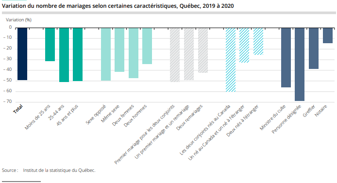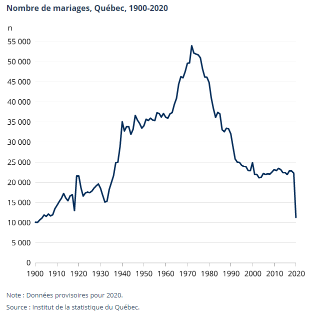 | Le nombre de mariages célébrés au Québec au plus bas depuis 1903 Posted: 13 Jul 2021 05:32 PM PDT Étant donné la gestion de la pandémie imposée, le nombre de mariages célébrés au Québec l’an dernier a atteint son niveau le plus bas depuis 1903 (alors que la population québécoise était 5 fois plus petite !), a révélé mardi l’Institut de la statistique du Québec (ISQ). Et l’année 2021 ne s’annonce guère mieux, selon des spécialistes de cette industrie durement touchée par la situation sanitaire. Au total, 11 300 couples ont formellement uni leur destinée pour le meilleur et pour le pire l’an dernier, soit de 49 % de moins qu’en 2019. Lors de la période forte, en mai, juin et juillet, cette baisse a même atteint 70 % par rapport à la moyenne des cinq années précédentes. Si l’écart par rapport aux dernières années s’est réduit à partir d’août, les premiers résultats mensuels de 2021 indiquent que le nombre de mariages demeure en dessous de la moyenne, ajoute l’ISQ. Baisse moins importante pour ceux dont les conjoints sont nés à l’étranger ou homos La diminution du nombre de mariages entre 2019 et 2020 (— 49 %) a été plus ou moins marquée selon différentes caractéristiques des mariages ou des personnes mariées. Par exemple, la baisse apparaît plus forte pour les mariages célébrés par une personne désignée (— 69 %) ou par un ministre du culte (– 56 %), mais elle est nettement moindre pour les mariages célébrés par un notaire (— 14 %) ou encore par un greffier (– 39 %). De même, la diminution a été plus importante parmi les couples formés de deux conjoints nés au Canada (— 60 %), tandis qu’elle apparaît moins marquée parmi les couples dont les deux conjoints sont nés à l’étranger (– 25 %) ou ceux dont un des conjoints est né à l’étranger (— 32 %). Le nombre d’unions civiles connaît une diminution comparable à celle des mariages Au Québec, les couples qui souhaitent s’unir légalement peuvent se marier ou opter pour l’union civile, qui a la même portée juridique que le mariage, et qui ne doit donc pas être confondue avec l’union libre ou un mariage célébré civilement. Très peu de couples choisissent de s’unir civilement. En 2020, 119 unions civiles ont été enregistrées, selon les données provisoires (non illustrées), ce qui correspond à une baisse de 43 % comparativement à 2019 (207 unions civiles). Cette chute étant d’une ampleur comparable à celle des mariages, la part des unions civiles parmi l’ensemble des unions légalisées est demeurée à seulement 1 % en 2020. |