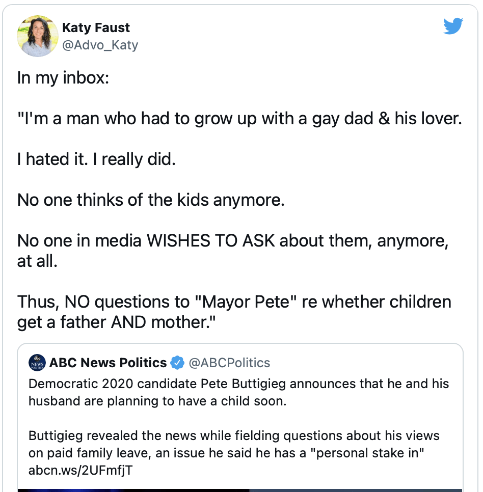 When Buttigieg first unveiled his intention of obtaining a child with his ‘husband’ in 2019, Katy Faust tweeted about the media’s unquestioning welcome of Buttigieg’s announcement. She conveyed the message of a man who had been raised by gays: “I’m a man who had to grow up with a gay dad & his lover. I hated it. I really did. No one thinks of the kids anymore. No one in media WISHES TO ASK about them, anymore, at all. Thus, NO questions to “Mayor Pete” re whether children get a father AND mother. ”