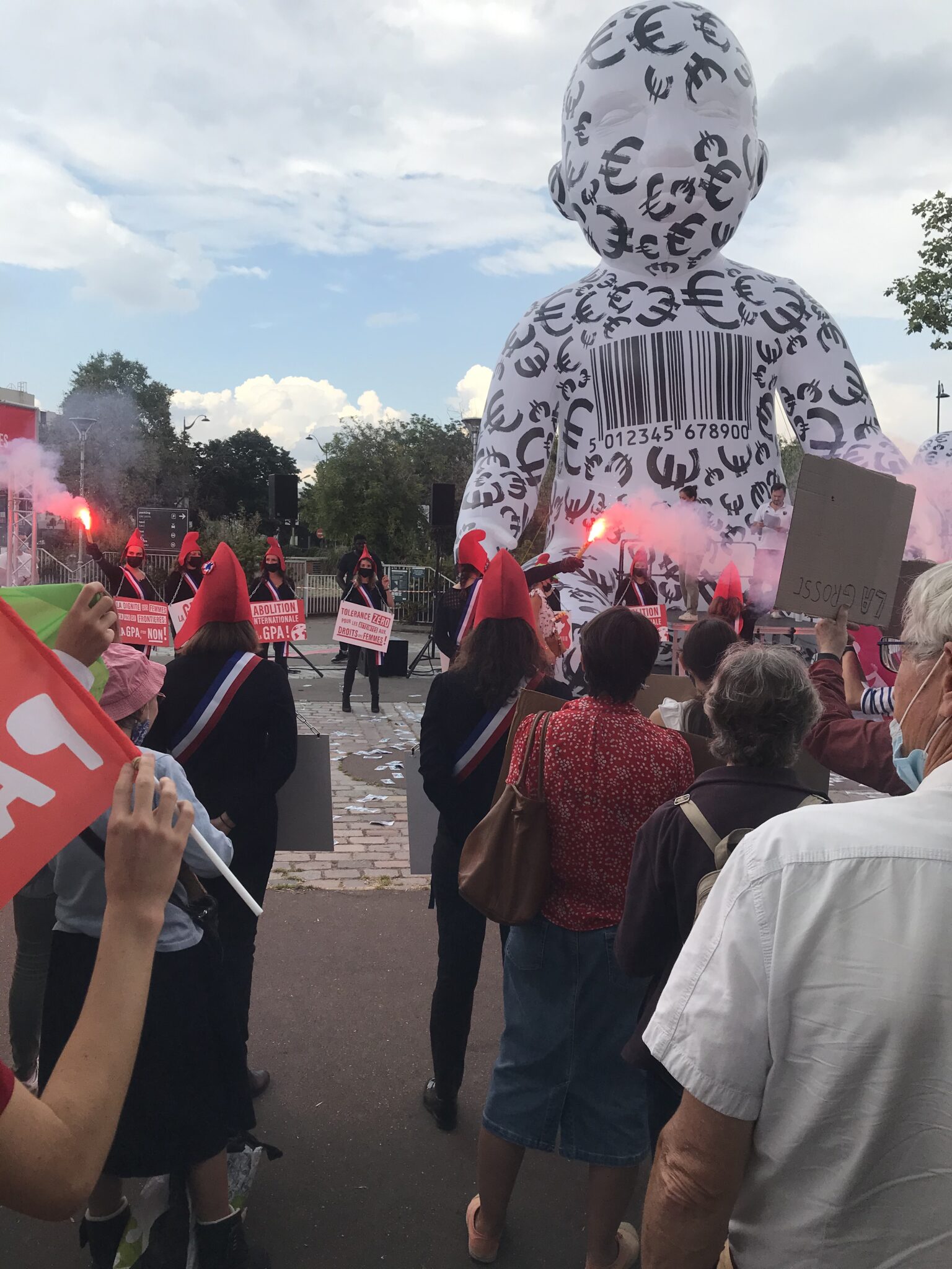 Pour souligner que l’exploitation des mères porteuses est une pratique interdite en France, une immense ligne rouge a été tracé par les jeunes devant l’entrée du salon. Une banderole fixée sur un portique d’entrée rappelle la réalité de ce salon « Ici, vente d’enfants / Ici, location de femmes ». Au dos, le même portique affiche un message bien différent pour les quelques visiteurs qui ressortent du salon : « Bienvenue dans une zone où on respecte la dignité des femmes et des enfants ».