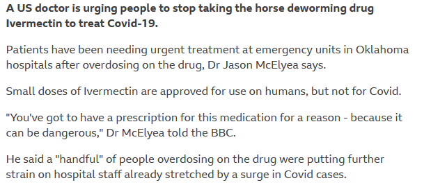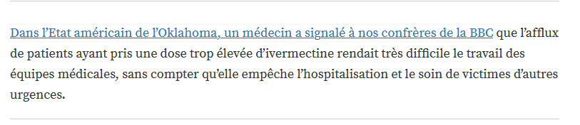 | Médias de grands chemins diffusent infos fausses ou douteuses sur l’ivermectine Posted: 05 Sep 2021 11:03 PM PDT De nombreux médias traditionnels comme le Guardian, la BBC, MSNBC et la RTBF ont colporté cette histoire sur l’ivermectine : La « nouvelle » telle que diffusée par la RTBF (diffuseur étatique belge) La « nouvelle » selon la BBC, notons que l’ivermectine est un antiparasitaire en rien limité aux animaux, elle est notamment utilisée pour lutter contre la cécité des rivières chez l’homme. Rachel Maddow, l’égérie de la gauche qui officie sur MSNBC relaie aussi la « nouvelle » L’ennui c’est que cette histoire n’est en rien confirmée et probablement fausse. Notons qu’aucun article ne précise quels sont les hôpitaux débordés par ces patients qui prendraient de l’ivermectine (sous forme vétérinaire).Un hôpital (voir ci-dessous) a démenti l’affirmation du Dr Jason McElyea selon laquelle les surdoses d’ivermectine causent des retards dans les soins médicaux aux urgences et des retards dans les soins médicaux dans l’Oklahoma rural. Selon le National Poison Data System, 459 cas de surdose d’ivermectine ont été signalés aux États-Unis en août. Les chiffres sur les surdoses d’ivermectine spécifiques à l’Oklahoma ne sont pas disponibles, mais il est peu probable que le nombre soit un facteur important dans la disponibilité des lits d’hôpital dans un État qui, selon le CDC, a actuellement une moyenne hebdomadaire de 1 528 hospitalisations pour Covid-19. Le médecin est affilié à un groupe de personnel médical qui dessert plusieurs hôpitaux de l’Oklahoma. À la suite de la publication à grande échelle de ses déclarations, un hôpital desservi par le groupe de médecins, le NHS Sequoyah, a déclaré que son service d’urgence n’avait traité aucune surdose d’ivermectine et qu’il n’avait pas eu à refuser toute personne cherchant à se faire soigner. On apprend par ailleurs qu’une autre « information » liée à l’ivermectine était fausse. L’agence de presse Associated Press avait fait circuler la rumeur selon laquelle 70 % des appels des centres antipoison du Mississippi auraient concerné des intoxications à l’ivermectine. L’agence a dû se rétracter : l’épidémiologiste du Mississippi, le Dr Paul Byers, a déclaré mercredi que le nombre d’appels au contrôle antipoison concernant l’ivermectine était plutôt d’environ 2 %. La difficulté de se faire prescrire de l’ivermectine par des docteurs fait que de nombreuses personnes se tournent vers l’ivermectine vétérinaire mal dosée pour l’homme. |