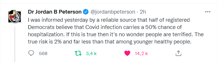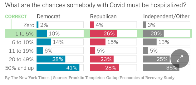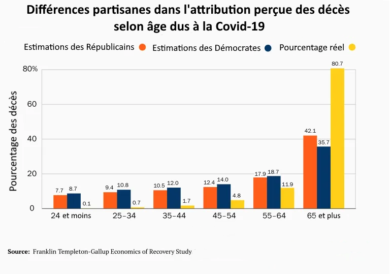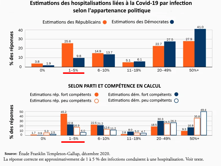 | États-Unis — Les Démocrates exagèrent nettement plus les effets de la Covid-19 que les Républicains Posted: 18 Sep 2021 09:43 AM PDT Mal informés, terrifiés, pas étonnant que les gens approuvent des mesures extraordinairesLe professeur de psychologie à l’université de Toronto, Jordan Peterson, revient sur ce sondage qui souligne les Démocrates exagèrent nettement plus les effets de la Covid-19. Merci les gros médias subventionnés qui prétendent être du côté de la « Science » ! Traduction: J’ai été informé hier par une source fiable [le New York Times dans un graphique] que la moitié [41 %] des démocrates enregistrés pensent que l’infection à Covid comporte 50% de risques d’hospitalisation. Si cela est vrai [oui, selon le sondage Franklin Templeton-Gallup], il n’est pas étonnant que les gens soient terrifiés. Le vrai risque est de 2 % et bien inférieur à celui des jeunes en bonne santé. Billet originel du 18 abril 2021 L’institut Brookings a utilisé les données mensuelles de 35 000 adultes qui ont répondu à l’étude économique Franklin Templeton-Gallup pour analyser les différences entre les électeurs démocrates et républicains sur une série de faits reliés à la Covid-19. L’affiliation politique a profondément façonné la manière dont les Américains comprennent et réagissent à la pandémie. Comme l’indique une autre étude de Gallup et d’autres instituts, les attitudes concernant les risques de la Covid-19 et la volonté d’adopter des gestes barrières comme la distanciation sociale sont fortement liées à l’affiliation politique des personnes interrogées, davantage que l’exposition locale au virus ou à des facteurs démographiques comme l’âge ou des comorbidités existantes.Le parti démocrate a fortement dramatisé la pandémie, sans doute désireux de ternir la fin du mandat de Donald Trump par cette catastrophe sanitaire. L’ancienne actrice Jane Fonda s’était même félicitée de l’épidémie de coronavirus la qualifiant de « cadeau divin pour la gauche ». La recherche nous apprend également que l’adoption de la distanciation sociale variait parmi les républicains qui regardaient Fox News, selon qu’ils étaient plus susceptibles de regarder Tucker Carlson — qui avait mis en garde contre le virus — ou Sean Hannity — qui l’avait d’abord minimisé. Désaccord sur les faits fondamentauxRisque par tranche d’âge Lorsqu’on lui demande d’estimer la part des décès par groupe d’âge, l’Américain moyen surestime considérablement la part des décès dus à la Covid-19 chez les personnes âgées de 24 ans et moins, la situant autour de 8 %, alors qu’en fait, elle était de 0,1 % jusqu’en août 2020 et est restée proche de ce niveau depuis. Pendant ce temps, les personnes âgées, celles de 65 ans et plus, représentaient 81 % des décès au moment de l’enquête (et 79 % jusqu’en novembre). Les démocrates surestimaient nettement plus que les républicains les risques pour les jeunes, même quand on tient compte des différences d’âge, de race, de sexe, de géographie et d’éducation. Le fait que la Covid-19 présente un risque de mortalité beaucoup plus élevé pour les personnes âgées que pour les jeunes était la caractéristique la plus claire du virus dès le début ; il est remarquable que de nombreux Américains restent mal informés sur ce facteur fondamental. Ce fait est peut-être moins étonnant quand on considère à quel point les médias progressistes pro-démocrates ont dramatisé les effets de la Covid-19 quitte à monter en épingle les très rares cas de jeunes qui mouraient de la Covid-19. Le risque grave en cas d’infection Le public américain, et particulièrement le partisan démocrate moyen, est également profondément mal informé sur la gravité du virus pour une personne infectée. En décembre, l’Institut Brookings a demandé : « Quel pourcentage de personnes infectées par le coronavirus a dû être hospitalisé ? » La bonne réponse n’est pas connue avec précision, mais il est fort probable qu’elle se situe entre 1 % et 5 % selon les meilleures estimations disponibles, et il est peu probable qu’elle soit beaucoup plus élevée ou beaucoup plus basse. (Plus de détails ici.) Moins d’un adulte américain sur cinq (18 %) donne une réponse correcte comprise entre 1 et 5 %. De nombreux adultes (35 %) disent qu’au moins la moitié des personnes infectées doivent être hospitalisées. Si cela était vrai, les millions de patients qui en auraient résulté auraient submergé les hôpitaux tout au long de la pandémie. Les démocrates sont beaucoup plus susceptibles que les républicains de surestimer ce risque. Quarante et un pour cent des démocrates et 28 % des républicains ont répondu que la moitié ou plus des personnes infectées par la Covid-19 doivent être hospitalisées. Les républicains étaient également beaucoup plus susceptibles d’obtenir la bonne réponse, 26 % identifiant correctement le risque contre seulement 10 % des démocrates. Les chercheurs se sont ensuite demandé si la compétence en calcul (la numératie) de base pouvait jouer un rôle important dans la capacité des gens à appréhender correctement les risques. Cette supposition a été confirmée par les données. La numératie a été mesurée à l’aide d’une version modifiée du test de numératie de Berlin. Les personnes avec un score de numératie important ont choisi nettement plus souvent les réponses correctes quant au taux d’hospitalisation des personnes infectées, mais un écart partisan important subsistait, même parmi ceux qui avaient une numératie élevée. Ceux qui ont de faibles scores en numératie surestiment considérablement les risques d’hospitalisation, quel que soit le parti, mais les démocrates sont encore plus susceptibles de se tromper. Ces chiffres n’ont pas échappé à Bill Maher, un libertarie